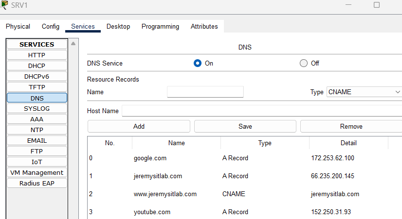 - Configure all routers and switches to use domain name jeremysitlab.com and use SRV1 as their DNS server.